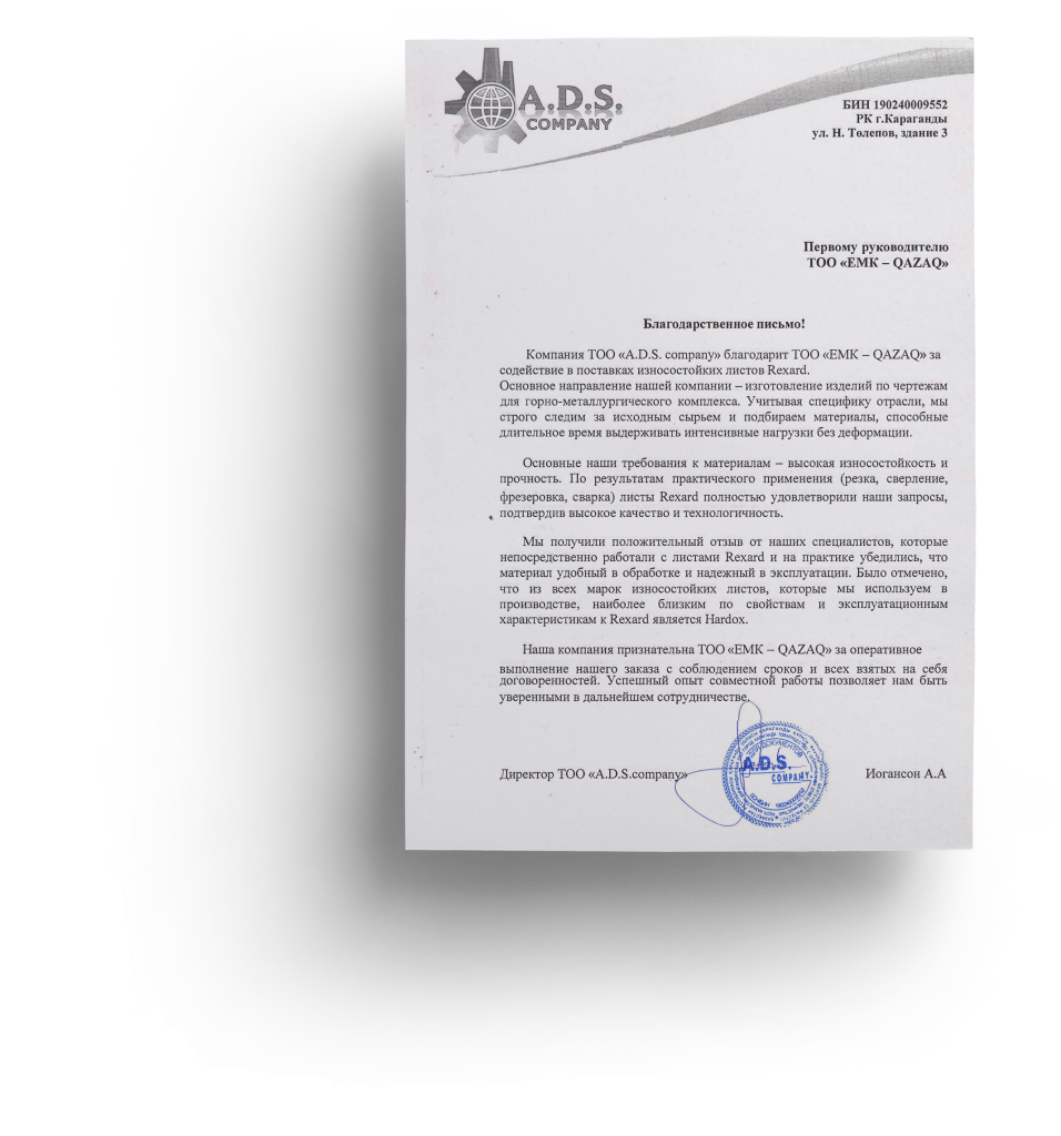 Решение: ООО «ЕМК – QAZAQ», изучив техническую документацию проекта, предлагает износостойкие листы REXARD 450.