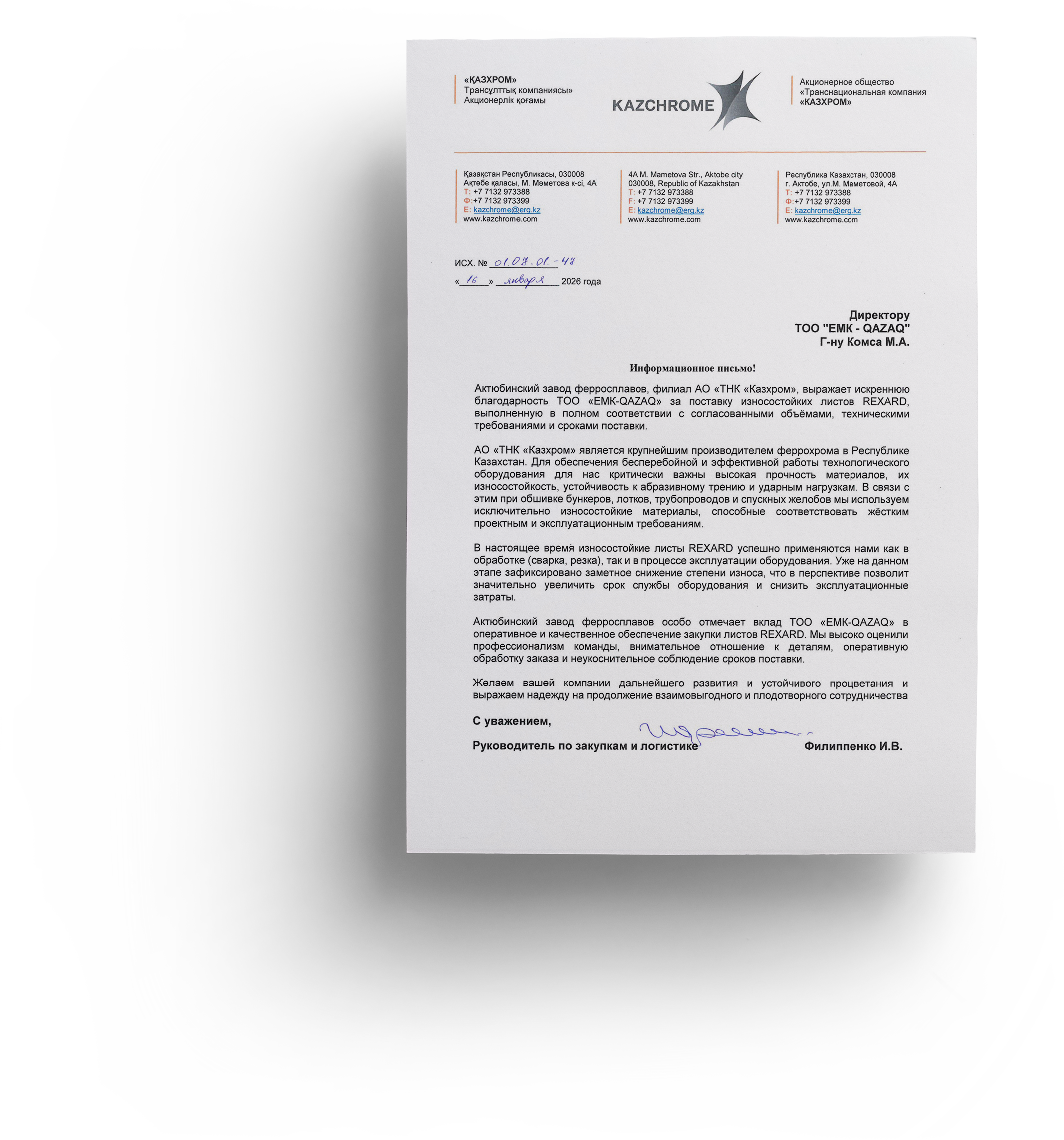 Решение: компания ЕМК – QAZAQ осуществила поставку износостойких листов REXARD.
